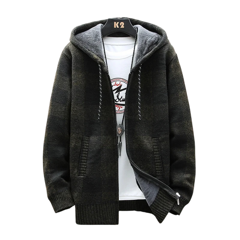 Stylischer Winter Herren Cardigan im karierten Muster mit Kapuze und Reißverschluss, hergestellt aus strapazierfähigem Polyester, warm und bequem, erhältlich in verschiedenen Farben. Vollständige Beschreibung