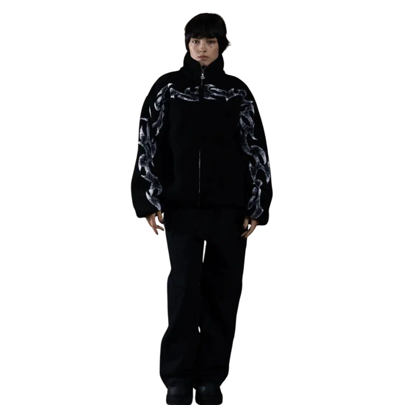 Herren Winterjacke Schwarze Plüsch Baumwolljacke mit Rollkragen Reißverschluss Taschen Weißes Motiv an den Ärmeln und der Brust Warme Winterjacke
