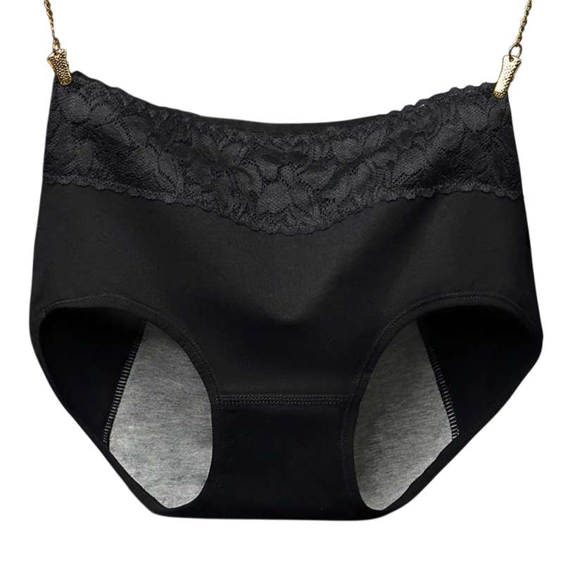 Menstruationsunterwäsche stellt eine bequeme und praktische Lösung für die Menstruationszeit dar. Sie wurde so entworfen, dass sie zuverlässigen Schutz bietet und gleichzeitig maximalen Komfort während des täglichen Tragens gewährleistet. Dank der Kombination von Materialien Baumwolle und Elasthan ist die Unterwäsche angenehm auf der Haut und gleichzeitig ausreichend elastisch, um sich gut an die Figur anzupassen. Die Konstruktion mit hohem Bund sorgt für einen stabilen und bequemen Sitz den ganzen Tag über. Die elegante Spitze am Bund verleiht der Unterwäsche ein zartes dekoratives Aussehen und bewahrt gleichzeitig den Komfort beim Tragen.