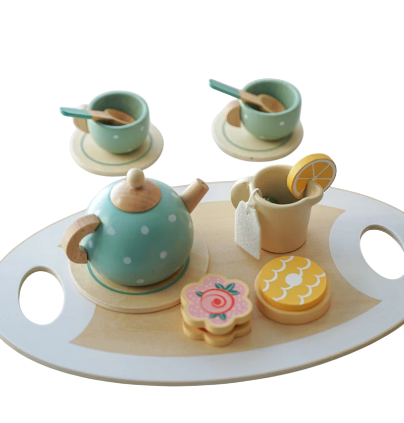 Dieses Holz-Teeservice ist das ideale Spielzeug für kleine Kinder, die gerne Erwachsene nachahmen und mit Kochen oder Servieren spielen. Es ist aus hochwertigem natürlichem Holz gefertigt und dank der glatten Verarbeitung auch für die kleinsten Kinder sicher. Das Set ist in einem angenehmen blauen Farbton gehalten und enthält alle notwendigen Zubehörteile für eine unterhaltsame Teeparty mit Freunden oder Plüschspielzeugen.