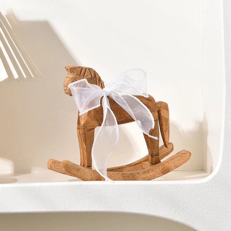 Das Holzschaukelpferd mit Stoffschleife ist eine Dekoration, inspiriert von einem traditionellen Motiv eines Kinderspielzeugs, das in eine kompakte Form für den Innenraum umgesetzt wurde. Durch die Ausführung aus natürlichem Holz in brauner Farbgebung wirkt es authentisch und lässt sich leicht mit weiterer Einrichtung kombinieren. Die weiße Stoffschleife, die am Hals des Pferdes platziert ist, bringt einen sanften Kontrast und ergänzt das Gesamtbild um ein textile Element. Das Ganze wirkt ausgewogen und unauffällig, zieht jedoch auf den ersten Blick die Aufmerksamkeit auf sich.