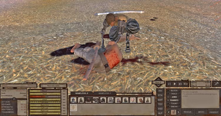 • Realistisches medizinisches System, das das Gameplay beeinflusst. Ein Charakter mit einem verletzten Bein wird hinken oder kriechen und die Gruppe verlangsamen, verletzte Arme bedeuten, dass Sie das Schwert nur mit einer Hand oder gar nicht verwenden können. Schwere Verletzungen führen dazu, dass Amputierte robotische Gliedmaßen benötigen. Blutverlust bedeutet, dass Sie ohnmächtig werden können und Blut zieht Raubtiere an. Die Statistiken des Charakters werden durch Ausrüstung, Gewicht, Blutverlust, Verletzungen und Hunger beeinflusst.