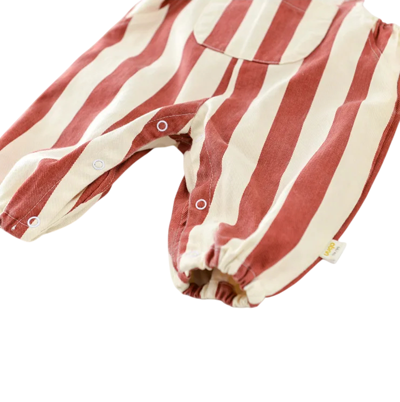 Der Overall ist so gestaltet, dass er die Bedürfnisse von Kindern und Eltern erfüllt – kombiniert Komfort, Funktionalität und Stil. Dank des Baumwollmaterials bleibt die Haut des Babys den ganzen Tag trocken und bequem, während der lockere Schnitt Bewegungsfreiheit beim Krabbeln und Spielen gewährleistet. Das niedliche Design mit dem Bären verleiht dem Outfit eine persönliche Note, die verspielt, aber gleichzeitig elegant wirkt. Dieser Overall eignet sich hervorragend als praktisches Geschenk für Neugeborene und Kleinkinder und lässt sich leicht mit T-Shirts oder Sweatshirts je nach Wetter kombinieren. Rote und beige Streifen verleihen dem Outfit zudem einen modernen Look, der nie langweilig wird.