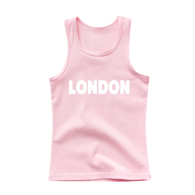 Startseite Startseite Kleidung und Accessoires Kinderkleidung Mädchenkleidung Tank Tops für Mädchen Kinder Baumwolltanktop mit London-Druck Einfarbiges ärmelloses T-Shirt mit Rundhalsausschnitt Bequemer Sommertop für Jungen und Mädchen Verschiedene Farben