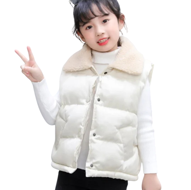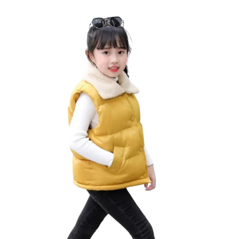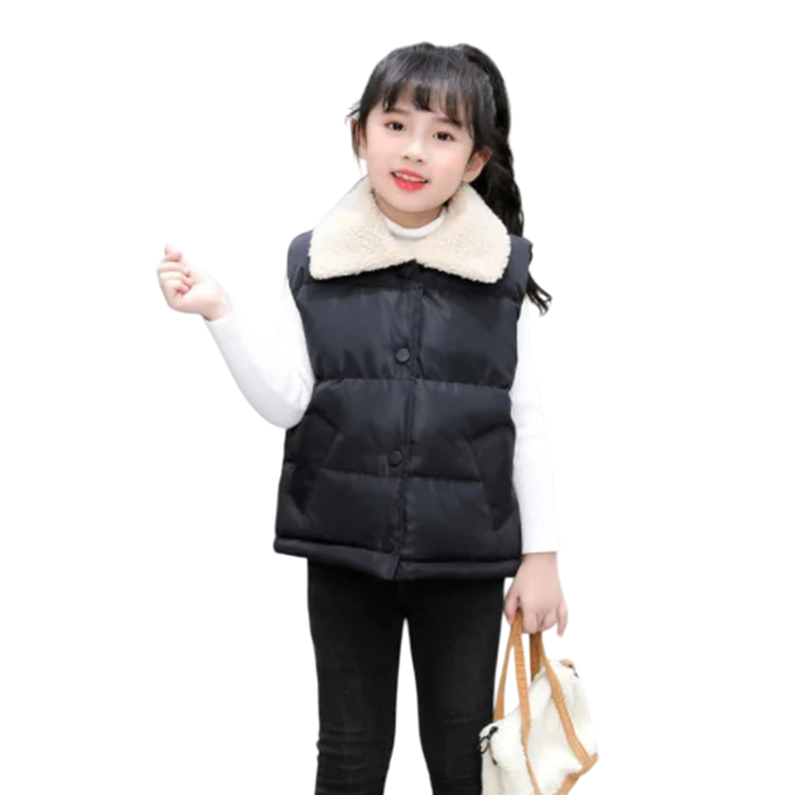 Warme Kinder Winterweste mit Kragen und Fleece-Futter. Bequemer Schnitt mit Druckknopfverschluss und Taschen, ideal für Jungen und Mädchen. Vollständige Beschreibung