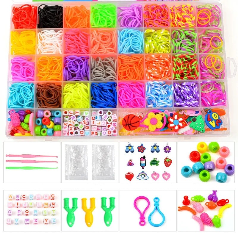Kreativset mit bunten Gummibändern in einem Organizer mit 40 Fächern und Zubehör. Ideal zur Herstellung von Armbändern, Halsketten, Anhängern und weiteren dekorativen Schmuckstücken. Vollständige Beschreibung