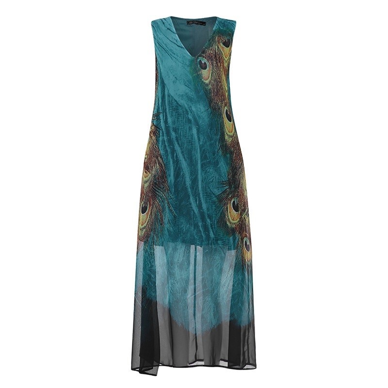 Damen Sommer Maxikleider mit schönem Pfauenmuster.