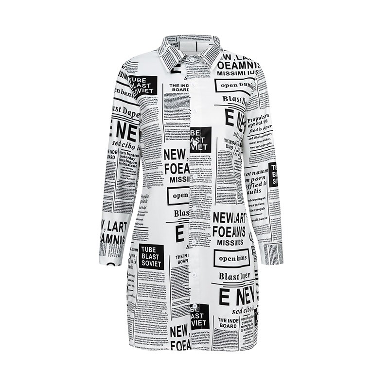 Das T-Hemd ist mit Aufschriften verziert, die wie Zeitungsartikel aussehen.