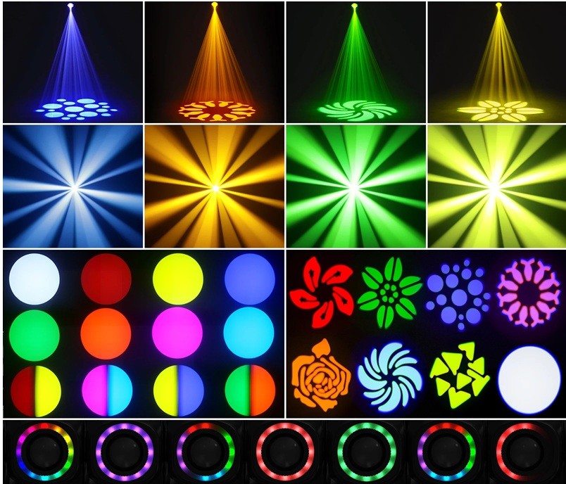 Der Projektor bietet 7 Farben und weißes Licht und verfügt gleichzeitig über 8 Lichtmuster, die bei der Beleuchtung der Tanzfläche, der Bühne oder des dekorativen Raums eingesetzt werden können. Die vielfältigen Farbeffekte können die Atmosphäre von Musikdarbietungen oder gesellschaftlichen Ereignissen ergänzen.