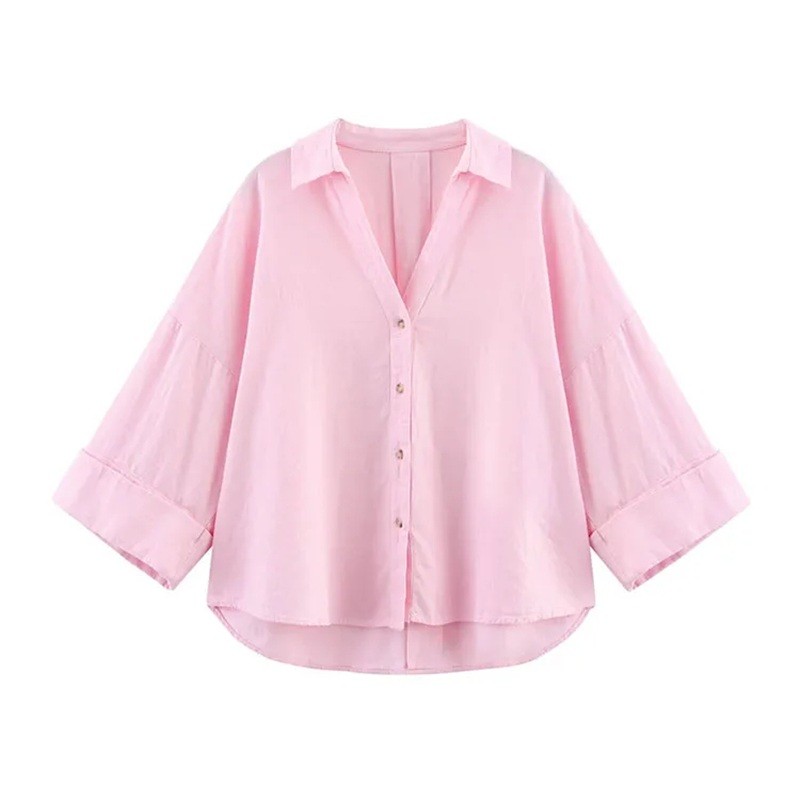 Startseite Startseite Kleidung und Accessoires Damenbekleidung Hemden für Damen Freizeithemden für Damen Leichte Damenbluse aus Leinen mit Kragen Weite Ärmel Asymmetrischer Saum Knopfverschluss Luftige Bluse aus Naturmaterial