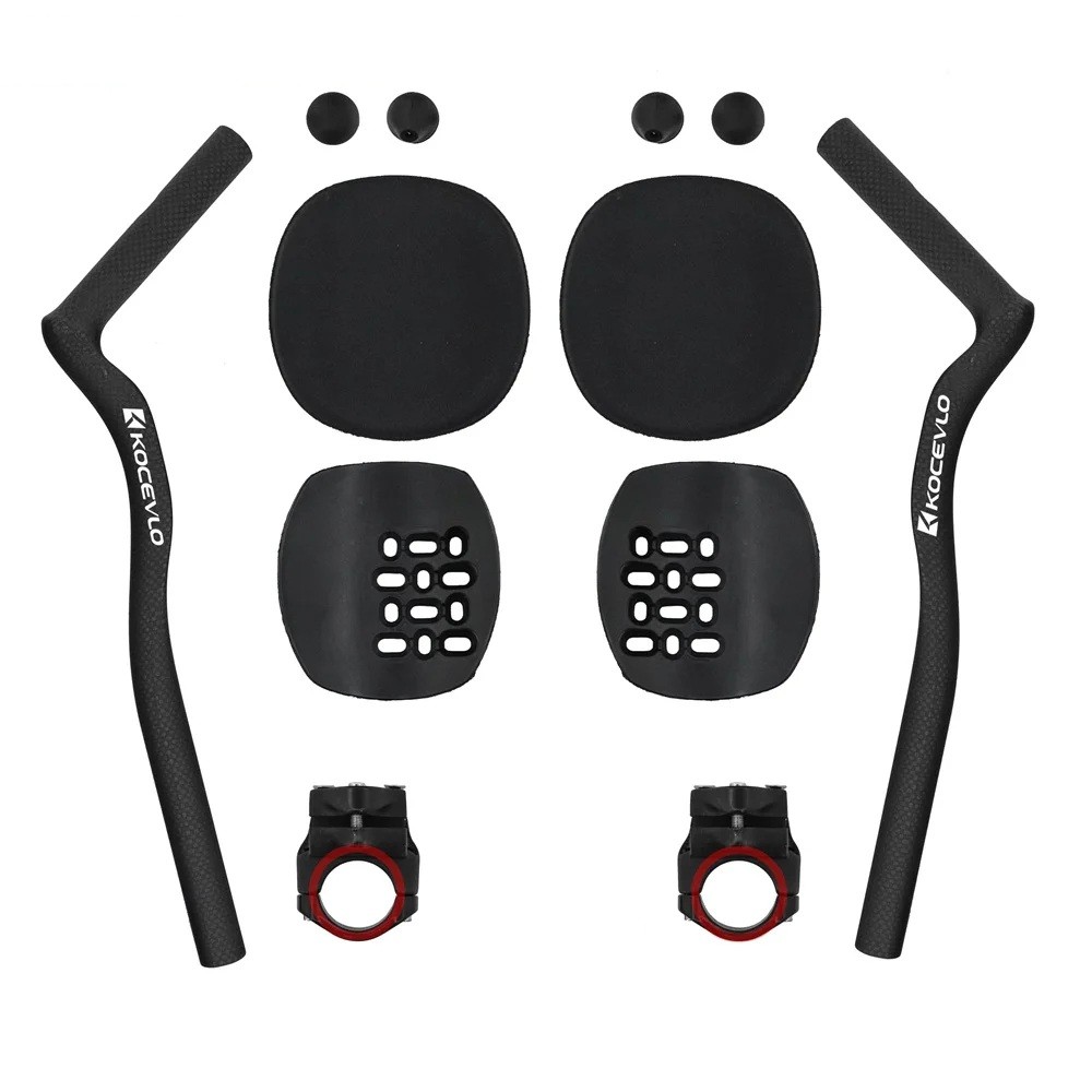Im Packungsinhalt sind gebogene Aufsätze mit einem Winkel von 45°, der deutlich gekennzeichnet ist. Diese Form ermöglicht eine Veränderung der Handposition während der Fahrt und eine Anpassung des Griffs. Darüber hinaus enthält das Set Armlehnen, die eine glatte Oberfläche und kompakte Form aufweisen, sowie perforierte Basen zur Befestigung.