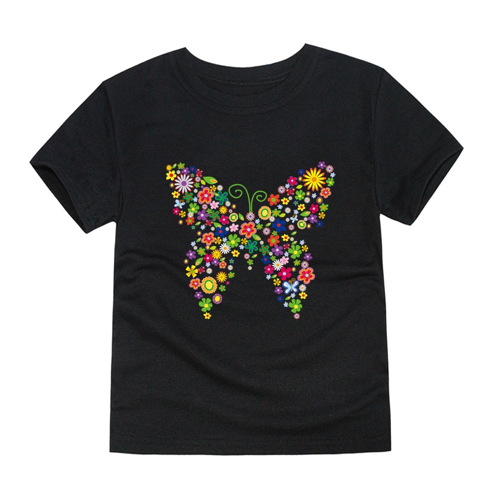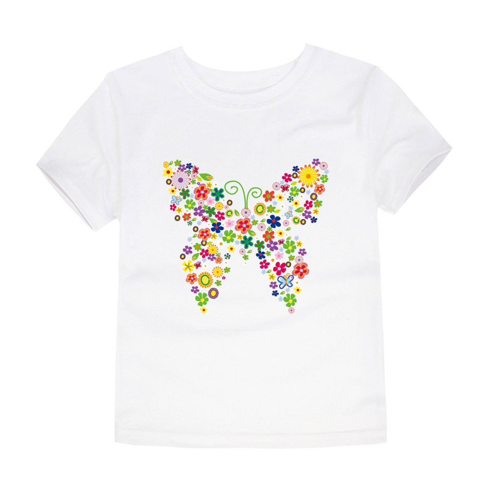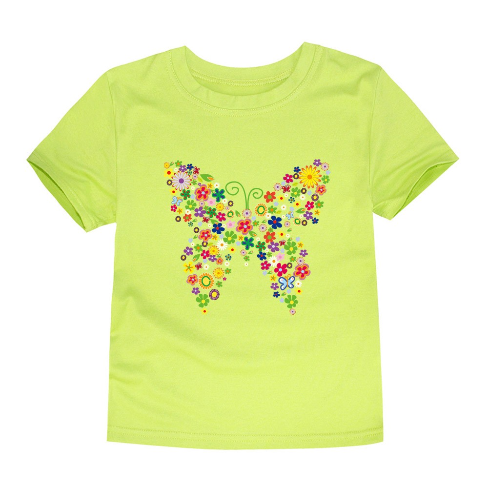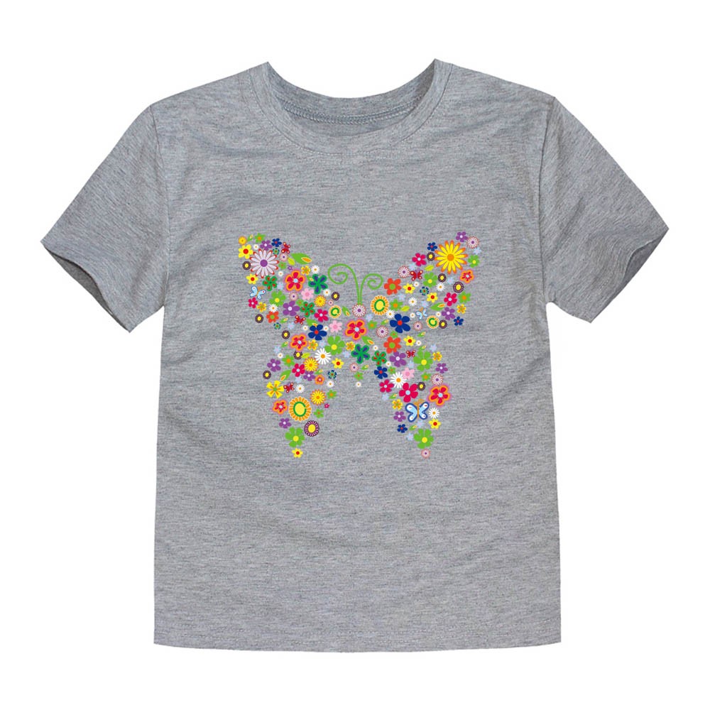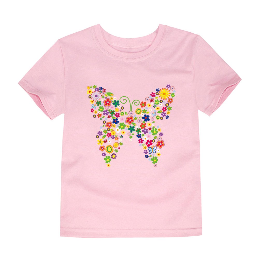 Mädchen-T-Shirt mit Schmetterlingsdruck, der komplett aus Blumen besteht.