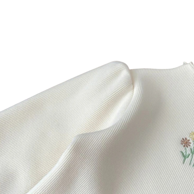 - Rüschensäume und Blumenstickerei verleihen einen zarten und eleganten Look