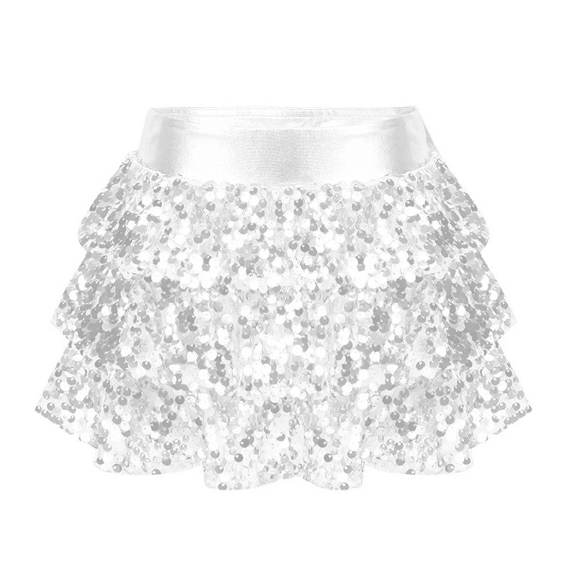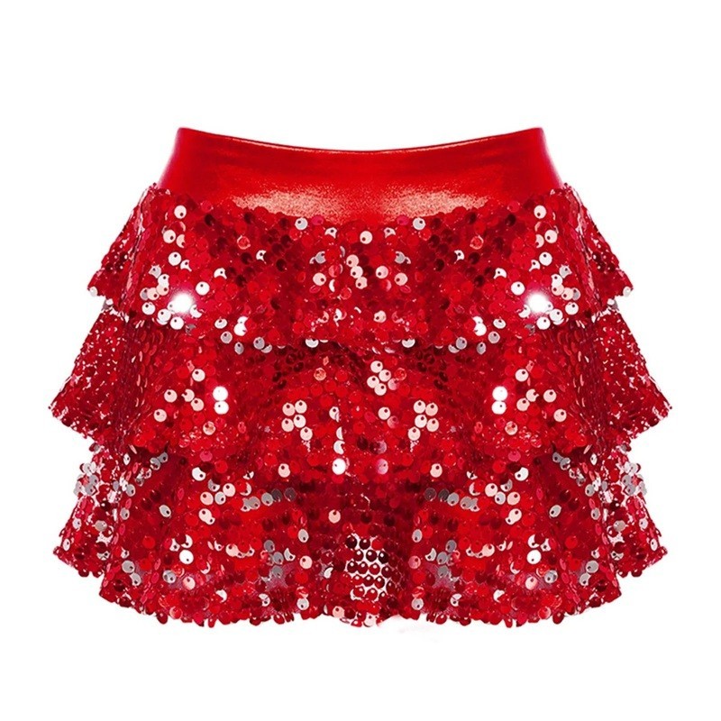 Glitzernder Rock mit Pailletten und Raffung, Länge über dem Knie, leichter Polyester geeignet für Feiern und Auftritte. Vollständige Beschreibung