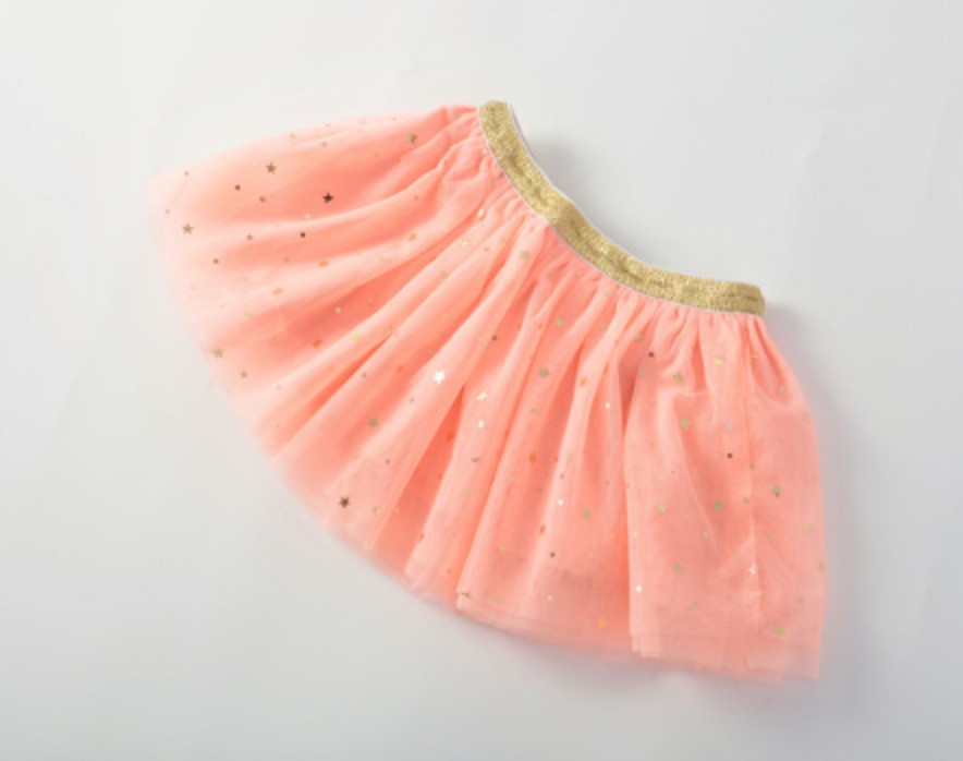 Ein wunderschöner Mädchenrock mit mehreren glitzernden Sternen und einem goldenen Streifen in der Taille.