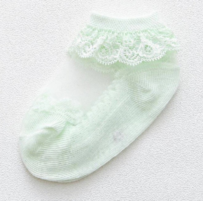 Die Socken haben einen durchscheinenden Spann. Der Saum ist mit zarten Rüschen verziert.