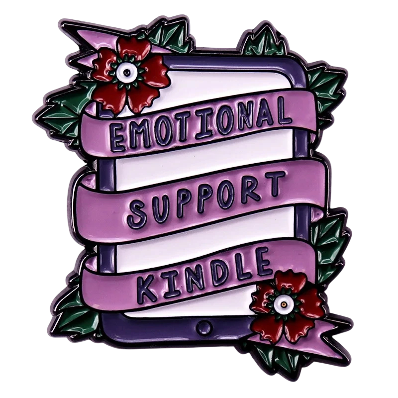 Die metallische Brosche in Form eines Lesegeräts besticht durch ihre grafische Gestaltung, ergänzt durch dekorative Elemente. Das Motiv zeigt ein stilisiertes Lesegerät, um das ein Streifen mit dem Text Emotional Support Kindle gewickelt ist. Das Gesamtbild wird durch Blumen und Blätter an den Seiten ergänzt.