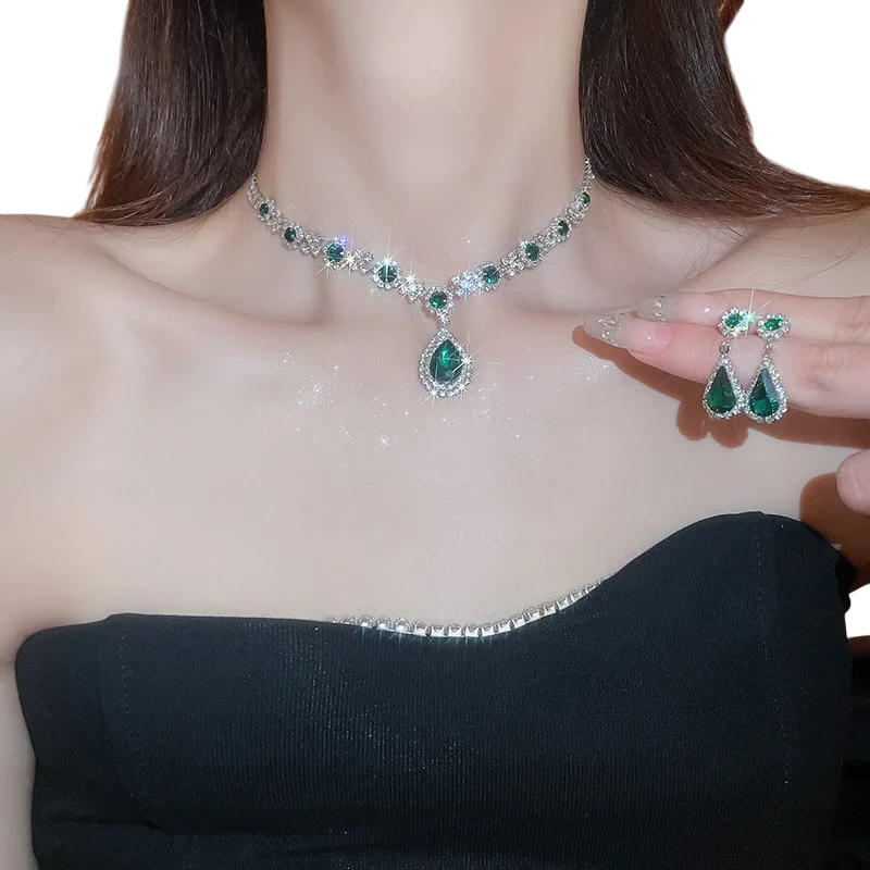 Dieses monumentale Set aus Halsreifen und Ohrringen ist für Frauen entworfen, die bei besonderen Anlässen auffallen und strahlen möchten. Das markante Edelsteindesign wirkt luxuriös und festlich und bewahrt dennoch die Zartheit und Eleganz, die für den Hochzeitstag und gesellschaftliche Ereignisse geeignet ist. Der Schmuck ist aus hochwertiger Kupferlegierung gefertigt, die Festigkeit, Langlebigkeit und schönen Glanz bietet. Dank der leichten Konstruktion handelt es sich um leichte luxuriöse Schmuckstücke, die auch bei ganztägigem Tragen während der Zeremonie und Feier bequem sind. Dieses elegante Set ist ideal für Bräute, Brautjungfern sowie Frauen und Mädchen, die nach einem auffälligen und gleichzeitig geschmackvollen Modeaccessoire suchen.