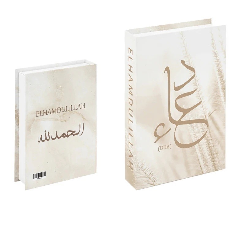 Öffnendes falsches Buch Elhamdulillah Beiger natürlicher Design mit Kalligrafie Dekorative Aufbewahrungsbox für Wertsachen