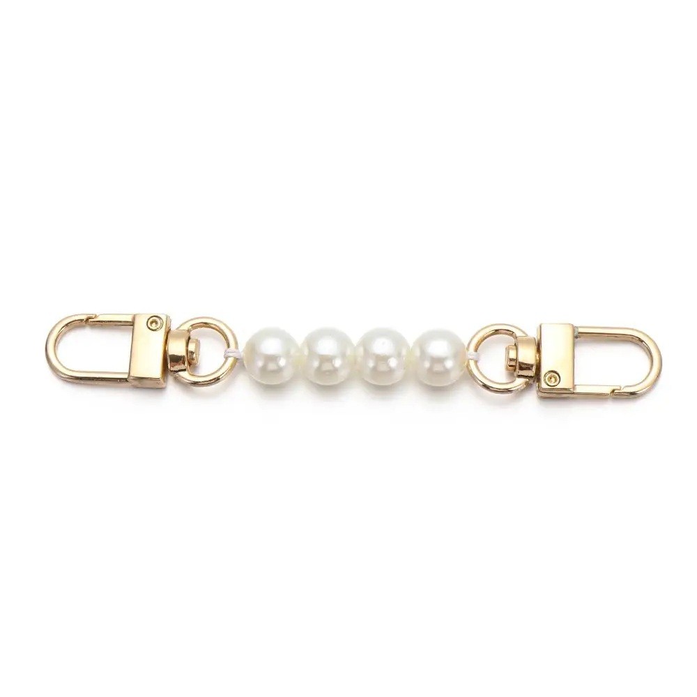 Diese Perlenkette bietet eine einfache Möglichkeit, der Handtasche ein neues und stilvolles Aussehen zu verleihen. Durch die Kombination von dekorativen Perlen und metallischen Karabinern wirkt sie sehr elegant und modern.