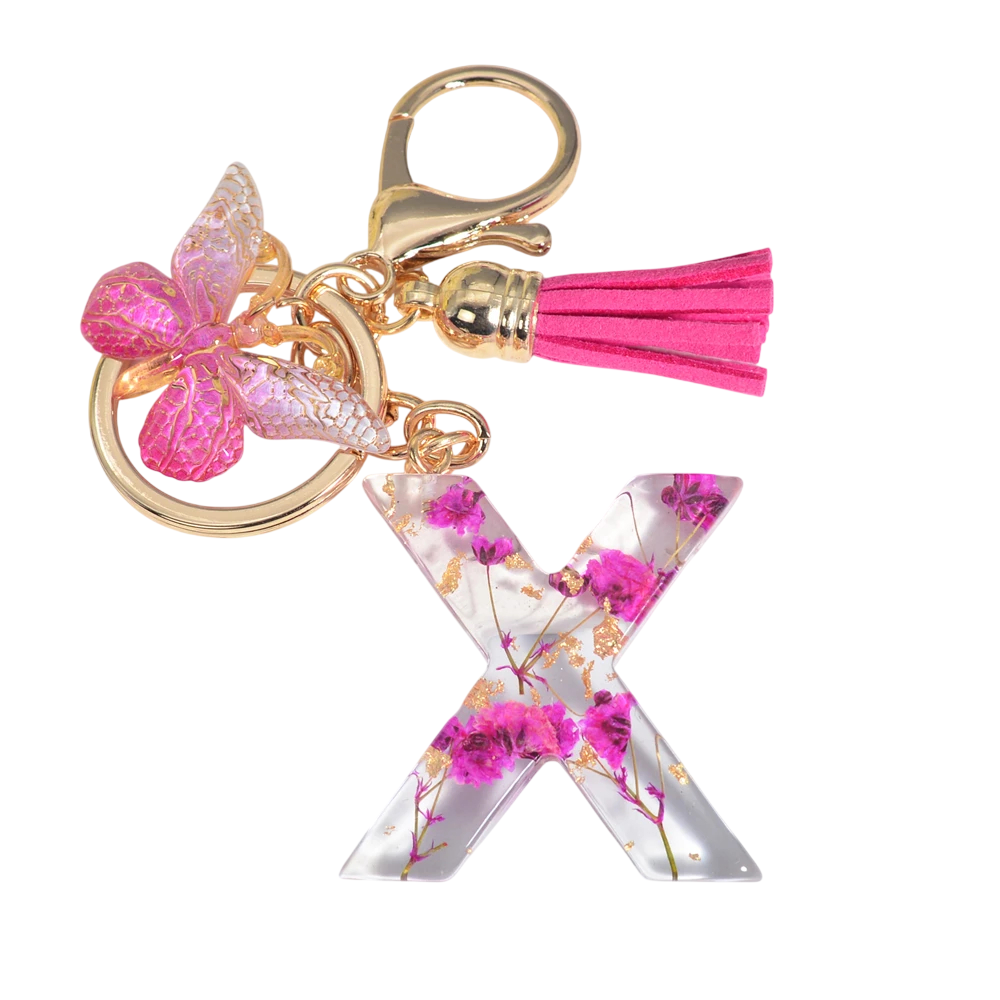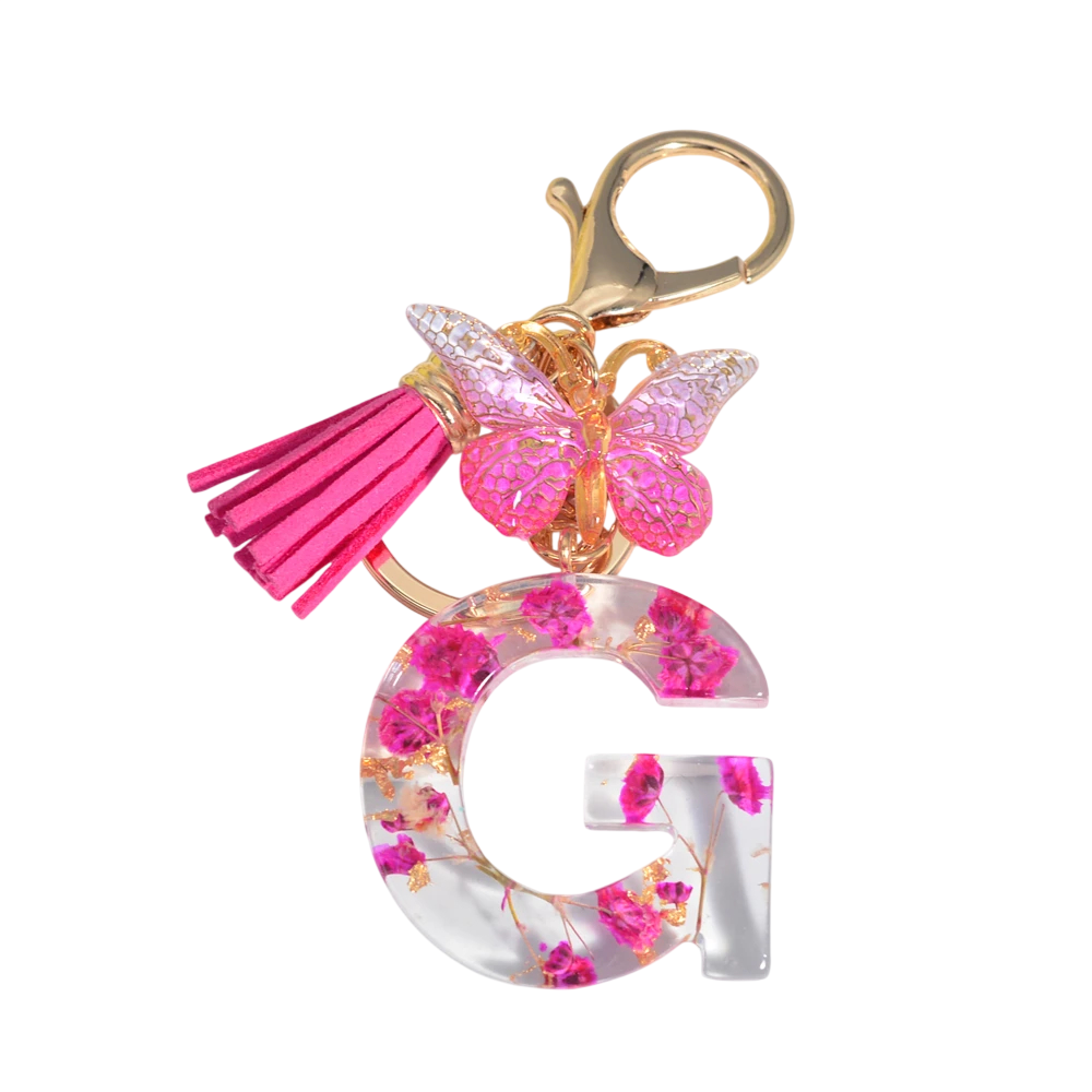 Eleganter Schlüsselanhänger aus Harz mit floralem Motiv und Initialen belebt Schlüssel und Handtasche und erfreut als persönliches Geschenk. Vollständige Beschreibung