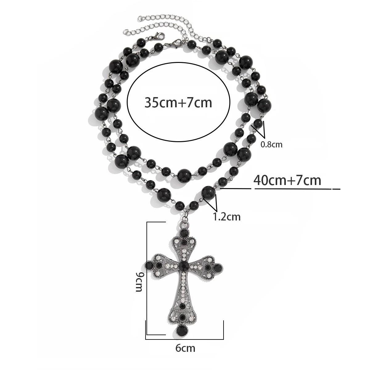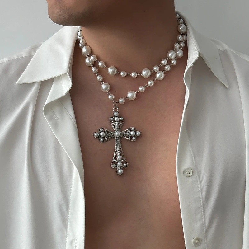 Auffälliger schichtiger Choker mit dominantem Kreuzanhänger und zwei verstellbaren Ketten, der zum Hauptelement jedes Outfits wird. Vollständige Beschreibung