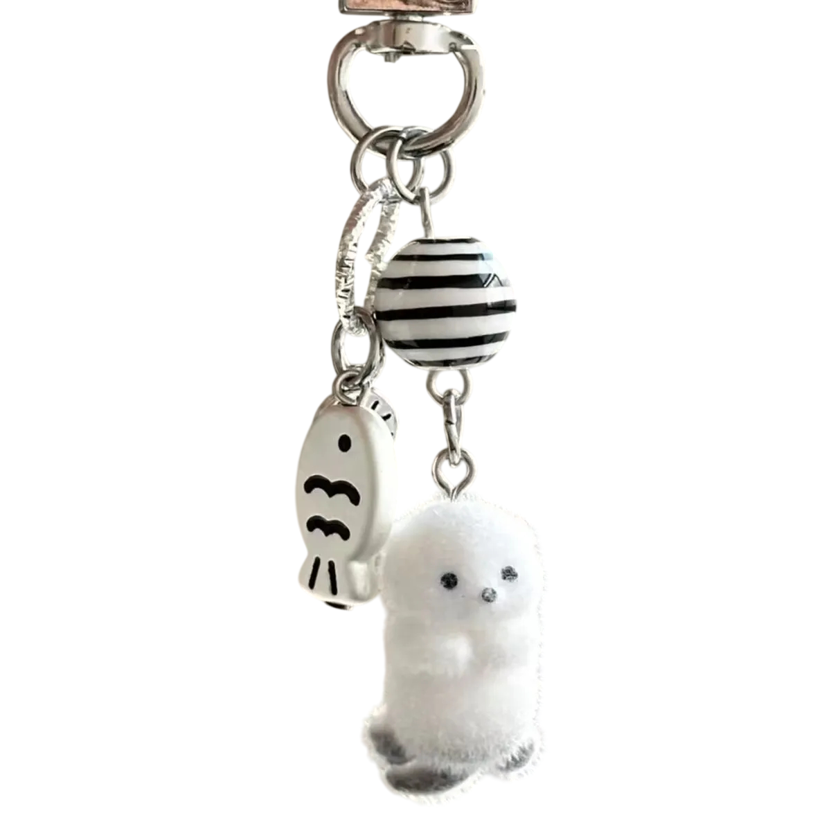 Niedlicher Anhänger mit flauschigen Eisbären und einer schwarz-weißen Perle, der Schlüssel und Rucksack schmückt. Originelles Accessoire für Kinder und Erwachsene. Vollständige Beschreibung