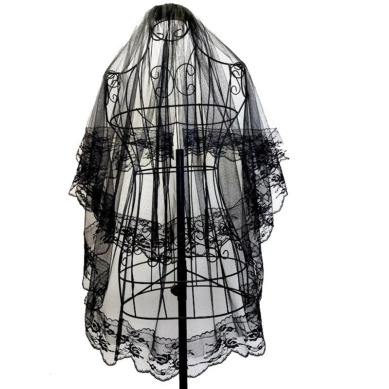 Zweilagiger schwarzer Schleier mit einer Länge von 75 cm, Spitzenrand und 5 cm Kamm. Stylisches Accessoire für Hochzeit und Cosplay. Vollständige Beschreibung