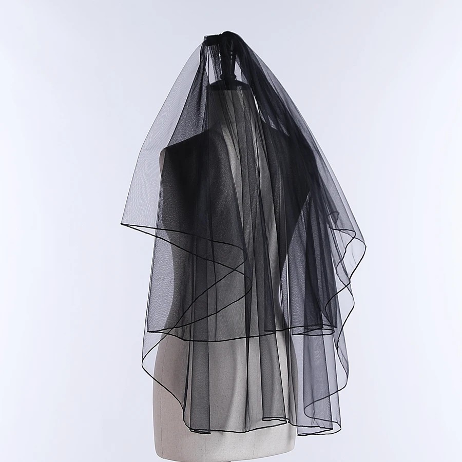Schwarzer Hochzeitsvorhang 87 cm Zweilagig Tüll Mit Kamm Ellenbogenlänge Einfacher Saum Eleganter Schleier für die Braut