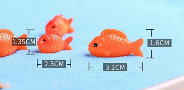 Die Figuren sind aus Harz gefertigt, das feine Details und ein realistisches Aussehen ermöglicht. Die Oberfläche der Fische ist so geformt, dass sie die natürliche Form kleiner Zierfische nachahmt. Die Länge beträgt etwa 2,3–3,1 cm und die Höhe beträgt etwa 1,35–1,6 cm, was eine einfache Integration in verschiedene Arten von Miniaturszenarien ermöglicht.