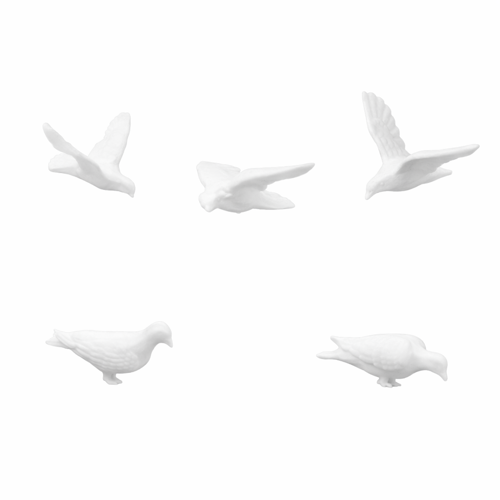 Kleine weiße Figuren von Tauben zur realistischen Ergänzung von Modell-Szenen, Dächern, Parks und natürlichen Details. Vollständige Beschreibung