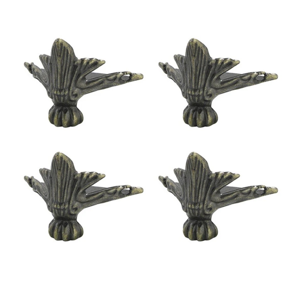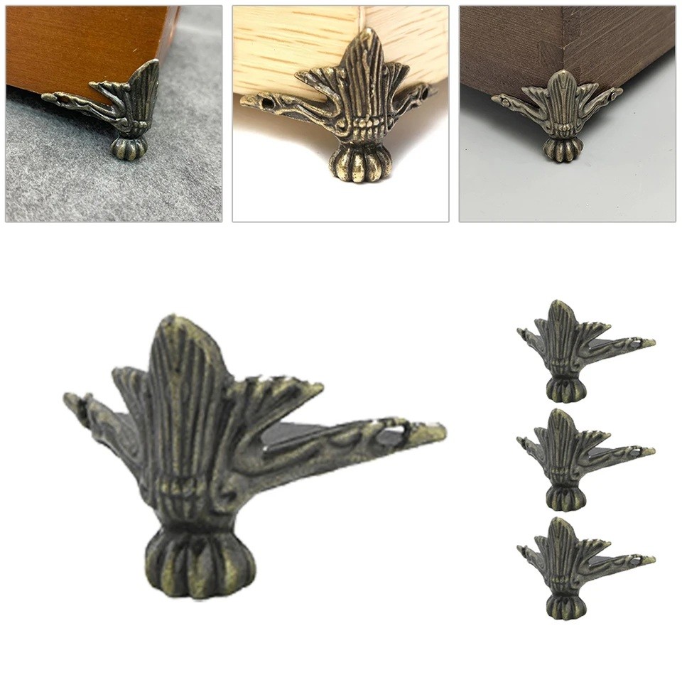 Die Füße haben ein Eckdesign, das eine präzise Anbringung an den Kanten des Produkts ermöglicht. Die metallische Verarbeitung sorgt für Festigkeit und Stabilität bei normalem Gebrauch. Die Oberfläche ist geformt mit einem dekorativen Element, das dem Produkt ein markanteres Aussehen verleiht. Die Konstruktion ist so gestaltet, dass die Füße sowohl eine schützende als auch eine unterstützende Funktion erfüllen. Sie sind für Holz- und andere feste Materialien geeignet.