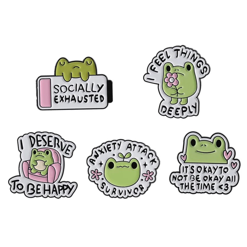 Set mit 5 emaillierten Pins Frosch mit Aufschriften, gezeichnetes Motiv, farbige Metallbroschen, Abzeichen für die Jacke, Rucksack, Kleidung, Zubehör