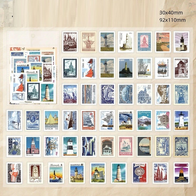 Set mit 50 Aufklebern in Form von Briefmarken mit Leuchtturm-Motiven, ideal für kreative Projekte, Glückwünsche und Dekorationen. Vollständige Beschreibung