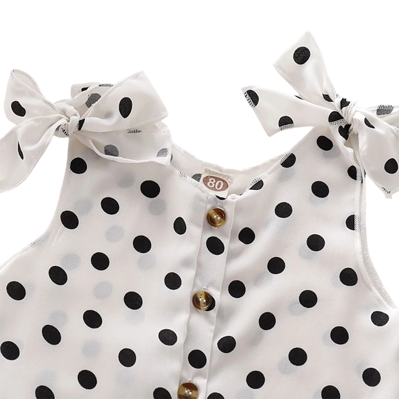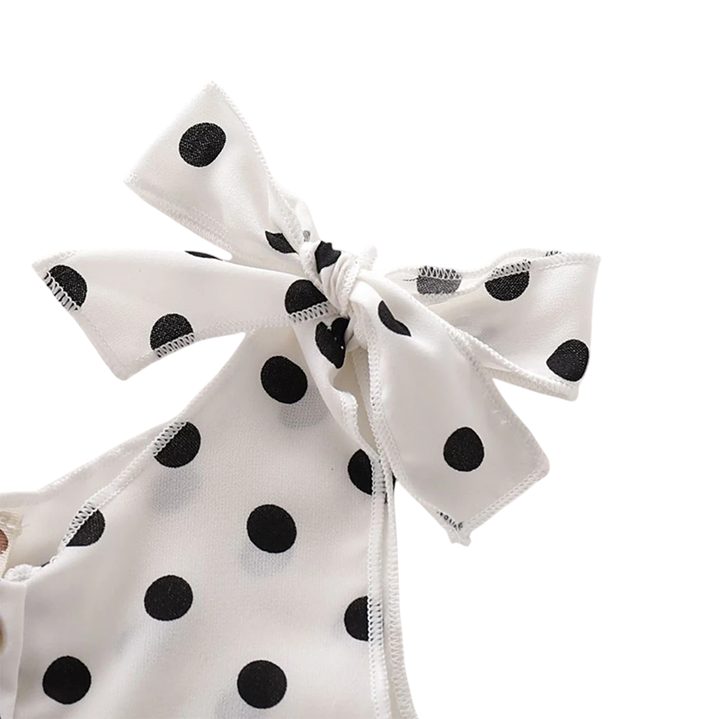 Sommerlicher Kinderoverall für Mädchen ohne Ärmel Weiß gepunktetes Modell mit Schleifen an den Schultern Baumwoll- und polyesterkurzer Overall mit Knöpfen