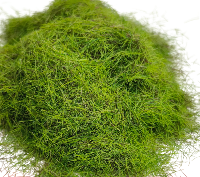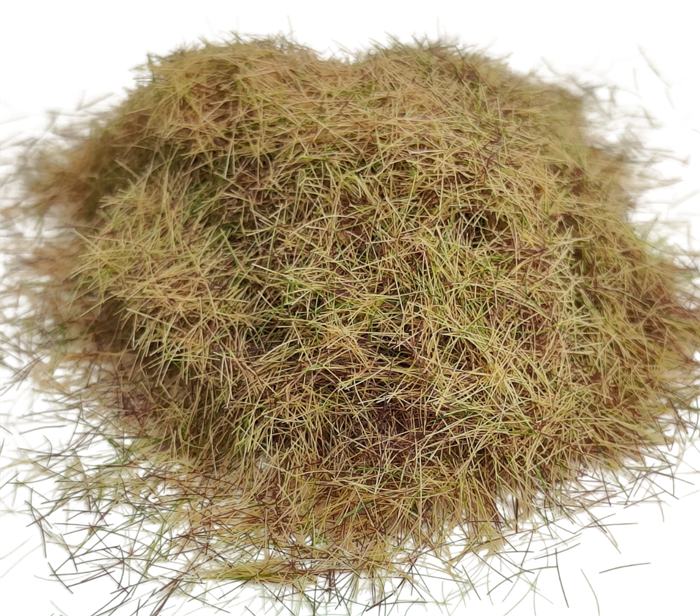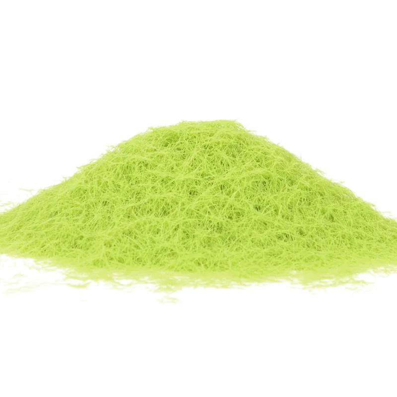 28–35 mm oder mehr beträgt. Längere Fasern simulieren höheres Gras, buschigen Bewuchs oder wilde Vegetation. Für das beste Ergebnis wird empfohlen, es auf eine mit Kleber behandelte Oberfläche aufzutragen und einen Streuwagen für statisches Gras zu verwenden, der das aufrechte Stehen der Fasern und ein natürliches Aussehen gewährleistet. Die Farbe des Produkts kann je nach Monitoreinstellung und Lichtverhältnissen leicht variieren.