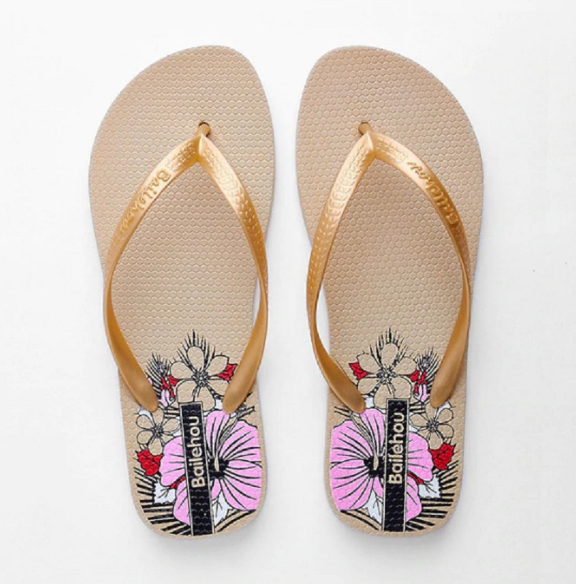 Diese Strand-Flip-Flops mit Blumenmuster sind die perfekte Lösung.