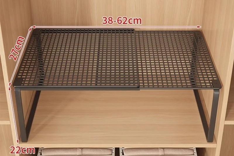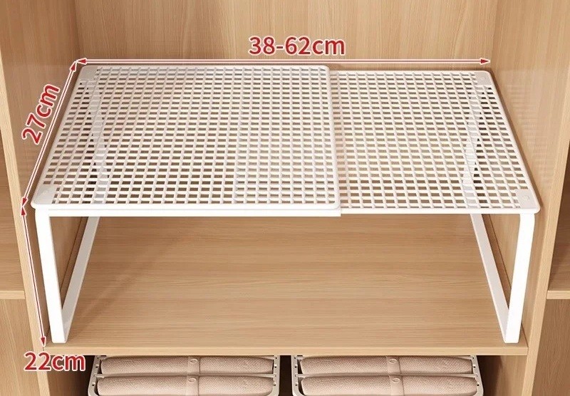 Startseite Startseite Haushalt Aufbewahrung und Organisation Regale Teleskopische Metallregal für den Schrank 38–62 cm Tiefe 27 cm Höhe 22 cm Verstellbarer Organizer für Kleidung und Schuhe