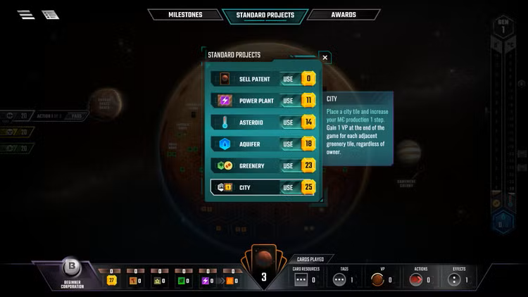 In Terraforming Mars steuern Sie ein Unternehmen mit einem bestimmten Profil. Spielen Sie Projektkarten, bauen Sie Produktionsstätten, platzieren Sie Ihre Städte und Grünflächen auf der Karte und wetteifern Sie um Meilensteine und Preise! Wird Ihr Unternehmen den Weg in eine neue Ära der Menschheit führen?