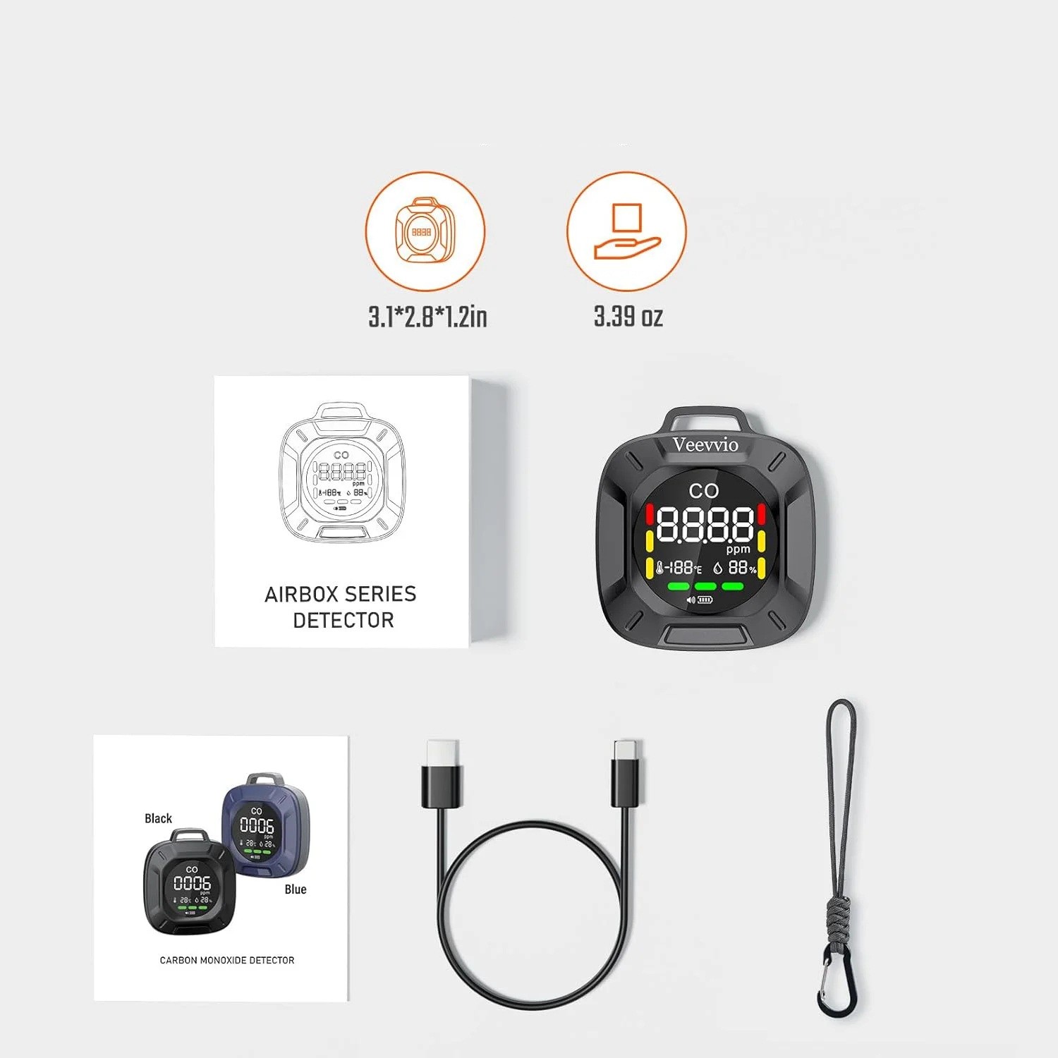 • 3-in-1 Anzeige: CO (ppm), Temperatur und Luftfeuchtigkeit für eine schnelle Orientierung in der Umgebung.
