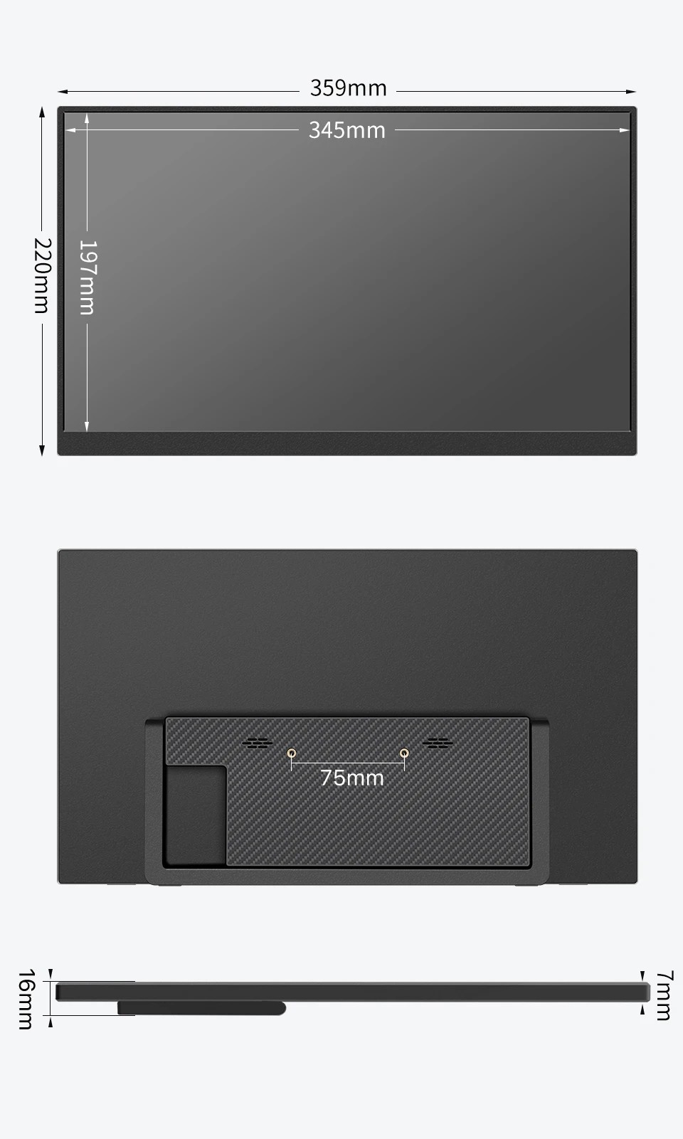 HGFRTEE 15,6" ist ein eigenständiger tragbarer Touchscreen-Monitor, der als zweiter Bildschirm für Laptops, Desktop-Computer oder Spielkonsolen gedacht ist. Es handelt sich nicht um ein Tablet – der Monitor enthält kein eingebautes Betriebssystem und funktioniert ausschließlich als externes Display. Er ist ideal für die Arbeit, das Spielen von Spielen sowie das Ansehen von Filmen zu Hause oder unterwegs.