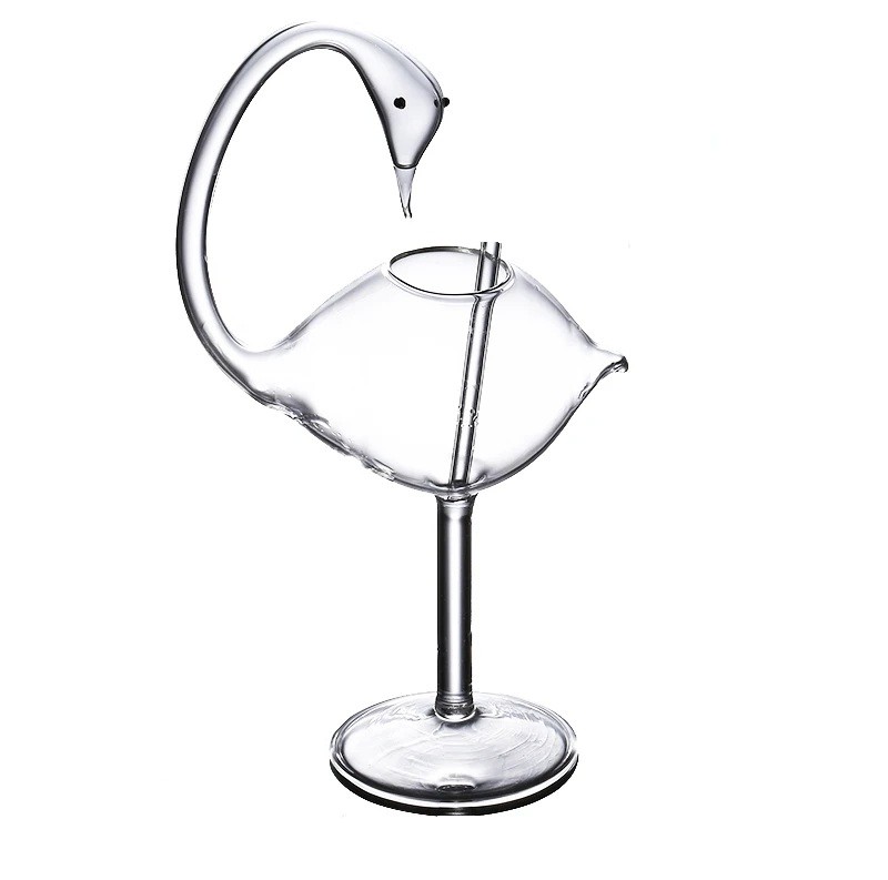 Das dekorative Trinkglas besticht durch sein Design, inspiriert von der Form eines Schwans. Der gebogene Teil des Glases erinnert an den Hals und den Kopf des Schwans, während der Körper das Behältnis für das Getränk bildet. Diese ungewöhnliche Form schafft ein markantes visuelles Element beim Servieren von Getränken.