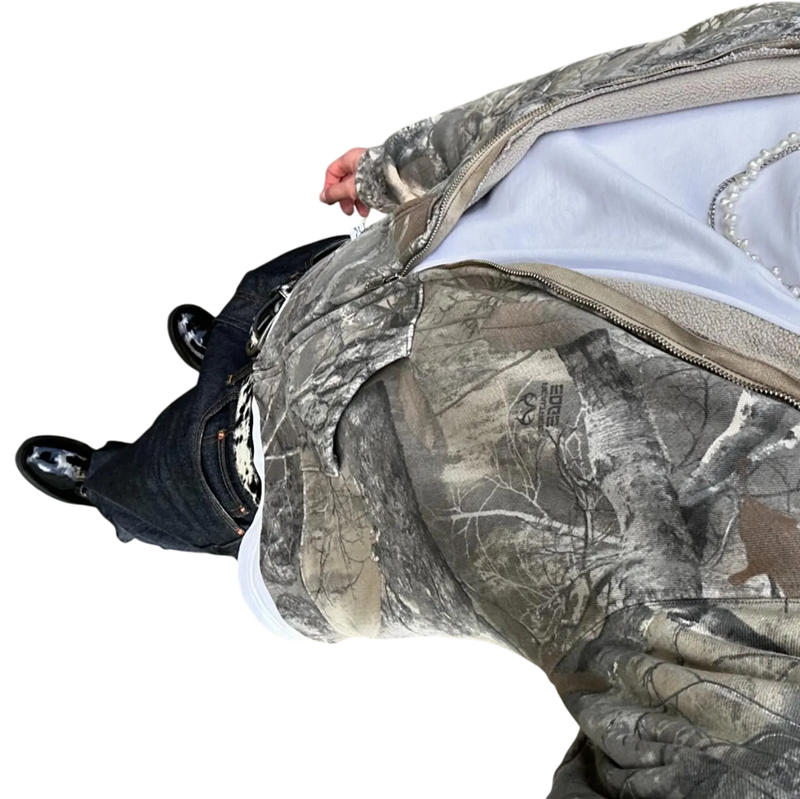 Moderne Unisex Kapuzenjacke mit Reißverschluss und Taschen im grauen Camouflage-Muster. Bequemes, leichtes und stylisches Modell für den täglichen Gebrauch. Vollständige Beschreibung