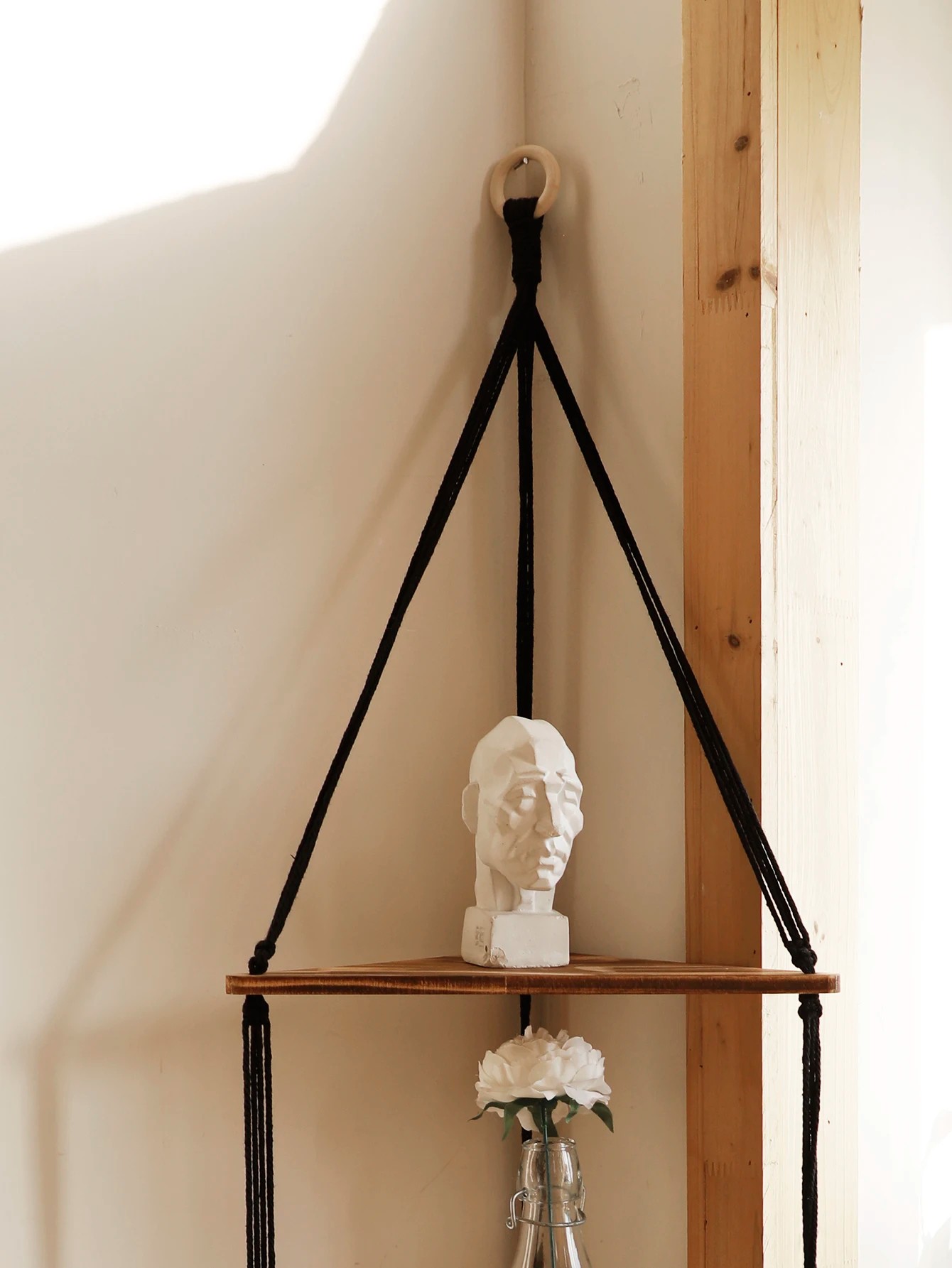 Startseite Startseite Haushalt Aufbewahrung und Organisation Regale Wandhängendes Eckregal 32 cm Dreitelliges Holzregal mit schwarzem Seil 122 cm an der Wand Ohne Dekorationen