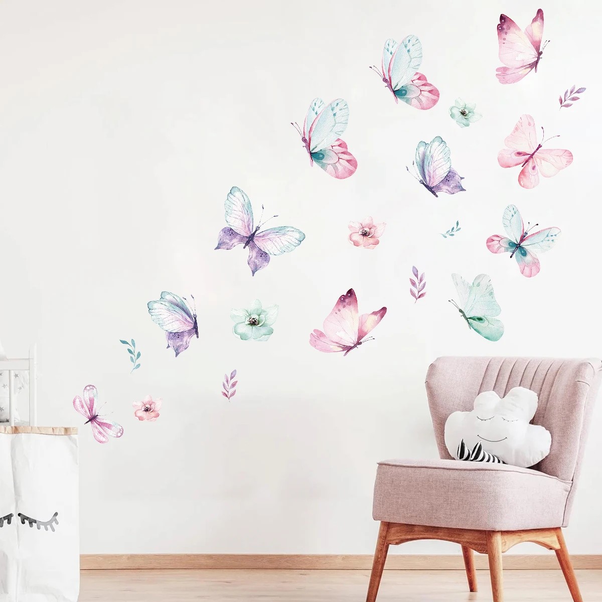 Set mit 3 Aquarell-Schmetterlingsstickern 22,5 × 30 cm aus PVC bringt sanfte Farben und romantisches Design an die Wände. Vollständige Beschreibung