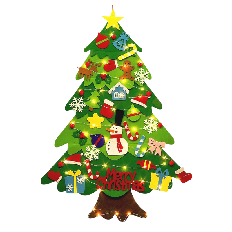 Spaßige Weihnachtsdekoration aus Filz mit LED-Lichtern und Dekorationen mit Klettverschluss. Ideal für Kinder und Familien, die ihren eigenen Weihnachtsbaum gestalten möchten. Vollständige Beschreibung