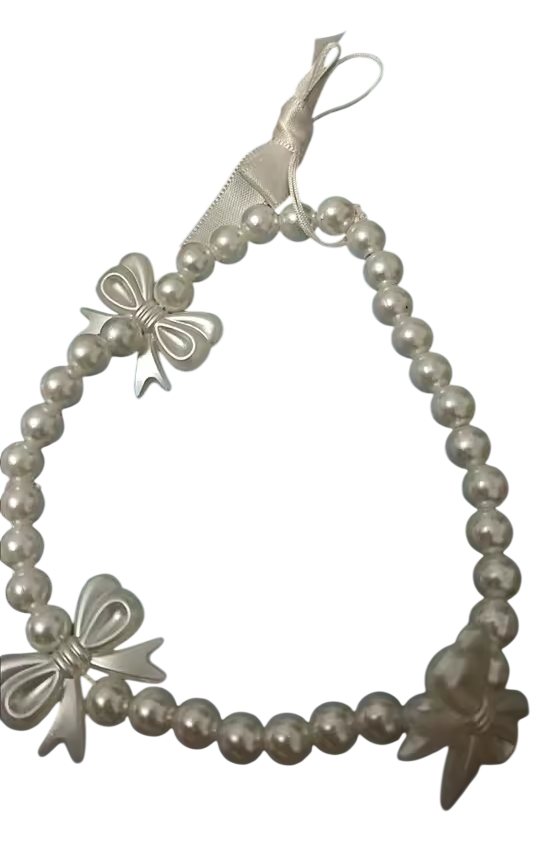 Elegantes weißes Perlenhandyband mit dekorativen Schleifen. Stylische Schnur gegen Verlust, geeignet für Handy, Schlüssel oder Handtasche. Vollständige Beschreibung