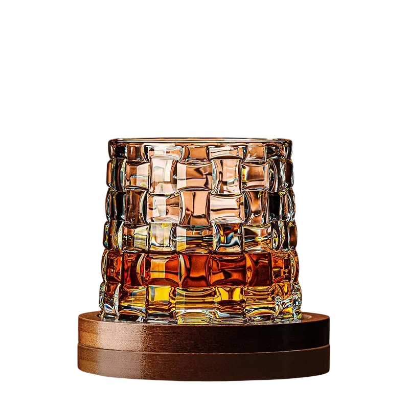 Luxuriöses Whiskyglas mit drehbarem 360°-Sockel und plastischer Mosaikstruktur für stilvolles Servieren Ihrer Lieblingsgetränke. Vollständige Beschreibung